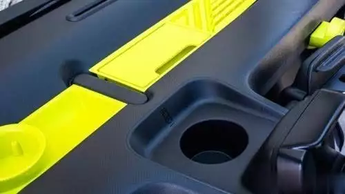 在采用硬塑料的仪表板上部,我们还发现了“Elektro Yellow”色调的控制台装饰,它们旨在提供智能存储解决方案,例如用于存放汽车文件的小手套箱或放置玻璃,而方向盘后面还有一个用于蓝牙扬声器的圆形插座。值得注意的是,Rocks Electric 没有空调或音响系统,这就是为什么欧宝人提供了 USB 和适当的外壳,以防驾驶员想让他的智能手机成为车辆的“信息娱乐”。