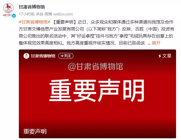 5月30日晚,甘肃省博物馆发布声明称,必胜客联名周边与甘肃省博物馆一毛绒玩具整体视觉效果高度相似,已致函要求立即停止涉嫌侵权的行为。