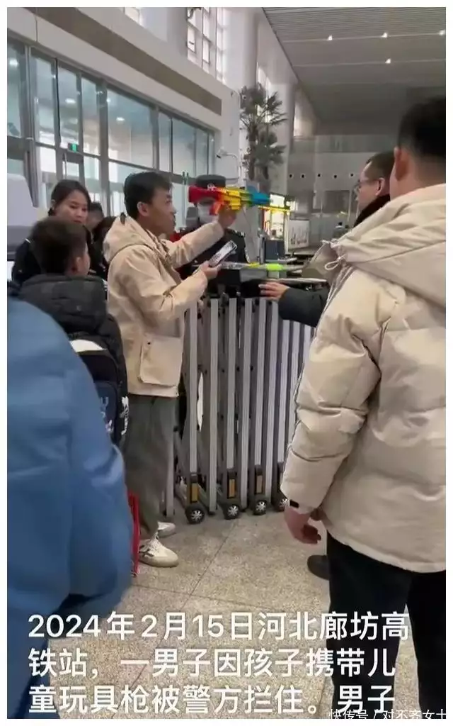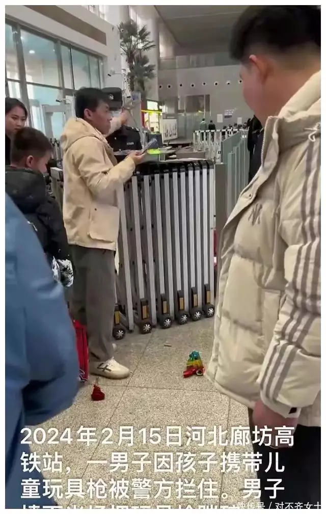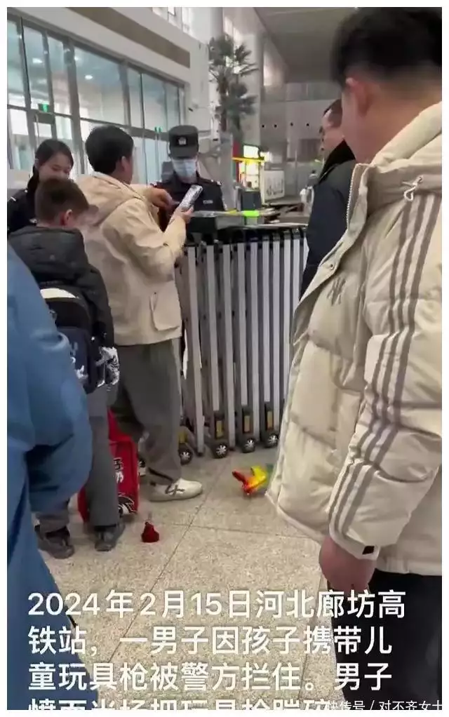 河北廊坊高铁站,男子因孩子携带儿童玩具枪被安检员拦下,男子沟通无果,愤怒之下竟然踩碎孩子的玩具枪。
