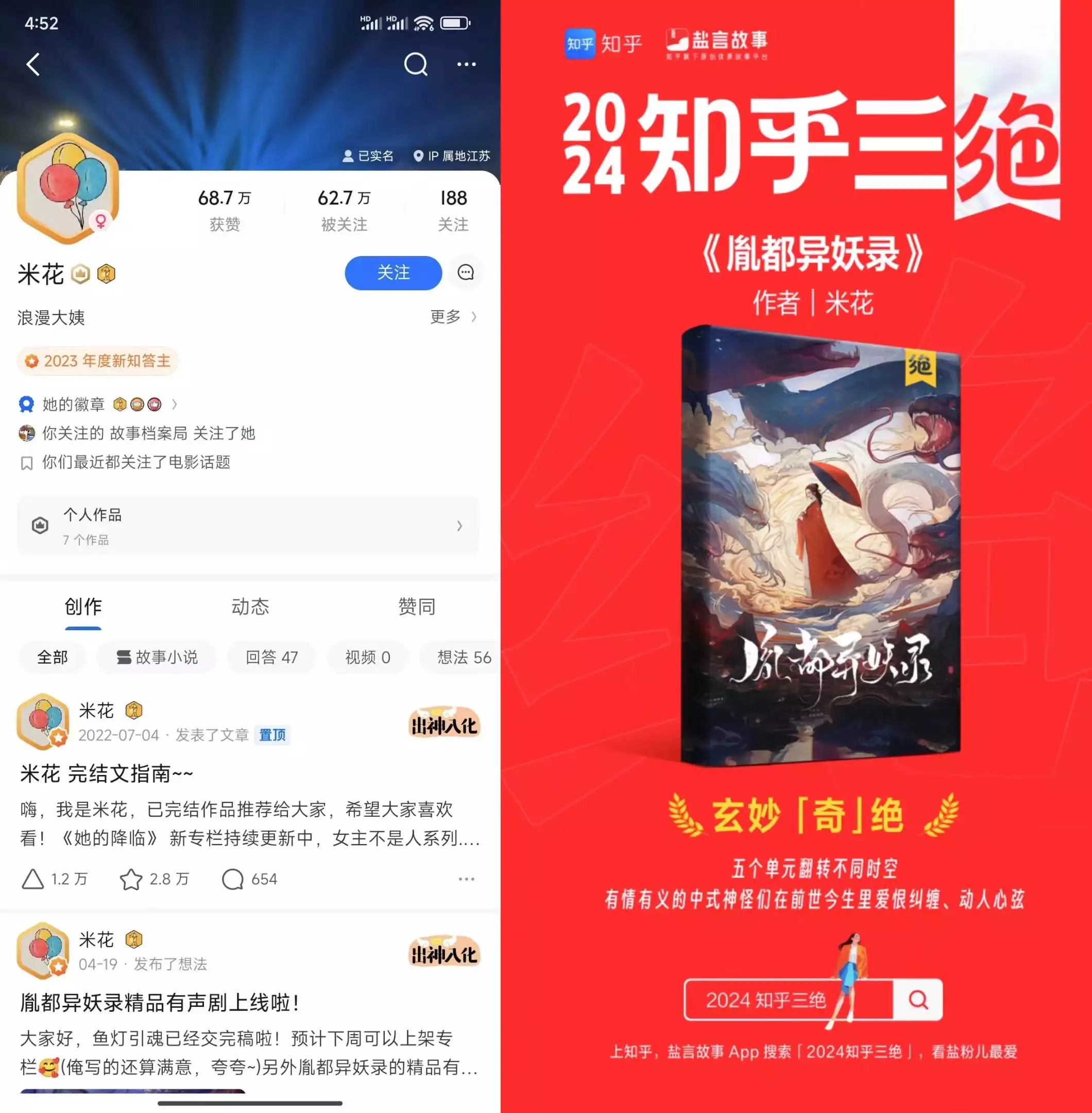 2022年,米花发表中式志怪题材故事《胤都异妖录》,该作品风格奇绝、天马行空,对中式神怪的塑造颇具古意,一举夺得知乎故事大赛·长篇创作马拉松第三季悬疑幻想赛道亚军,知乎评分高达9.9分,并被百万读者推选为“新知乎三绝”之首。