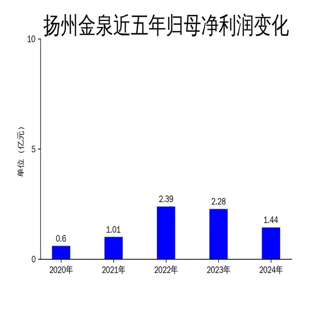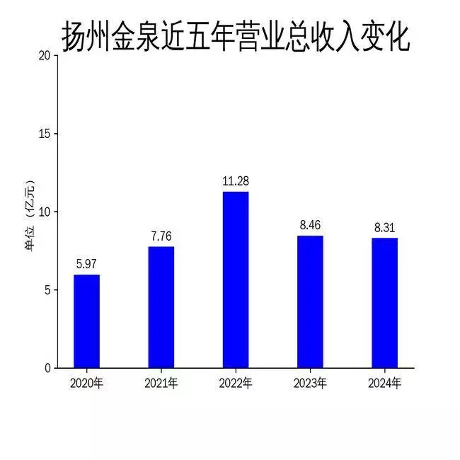 扬州金泉2024年的营业总收入为8.31亿元,较2023年的8.46亿元下降1.77%。虽然下降幅度不大,但归属净利润和扣非净利润的降幅却分别达到36.89%和41.32%,显示出公司在盈利能力上的显著下滑。回顾过去几年,2022年公司曾实现营业总收入11.28亿元,净利润2.39亿元,创下历史新高,但此后业绩逐年下滑,2023年和2024年净利润分别下降4.85%和36.89%。