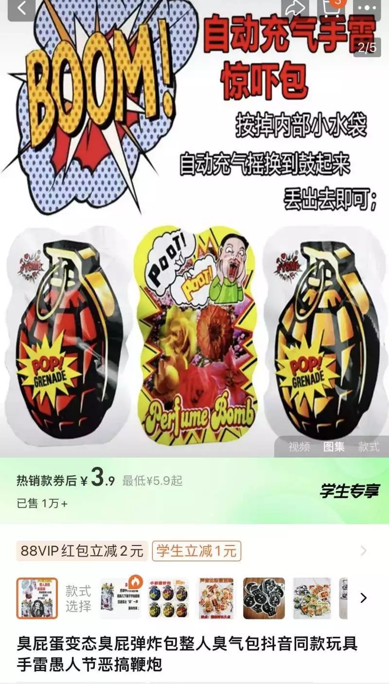 但在线上购物平台,“臭屁包”“炸蛋玩具”仍在热卖,并广受欢迎。有电商平台上的“炸蛋玩具”价格低至一毛一袋,产品页面显示已售超过1万单。