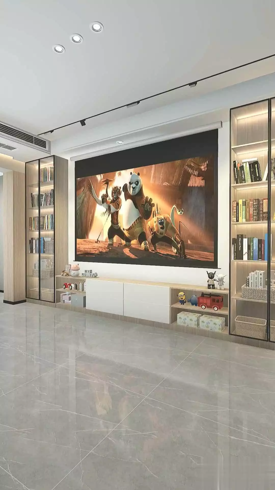 利用垭口做立柜,书籍和摆件都能装下。对称式设计,收纳瞬间多一倍。中间电视柜连接,可以用来收纳小朋友的玩具。装超大投影幕布,时尚颜值也高。