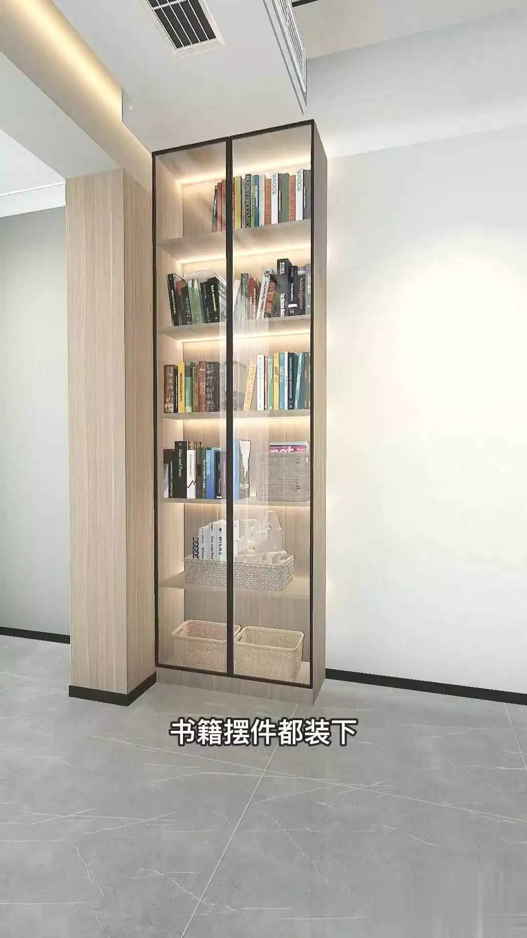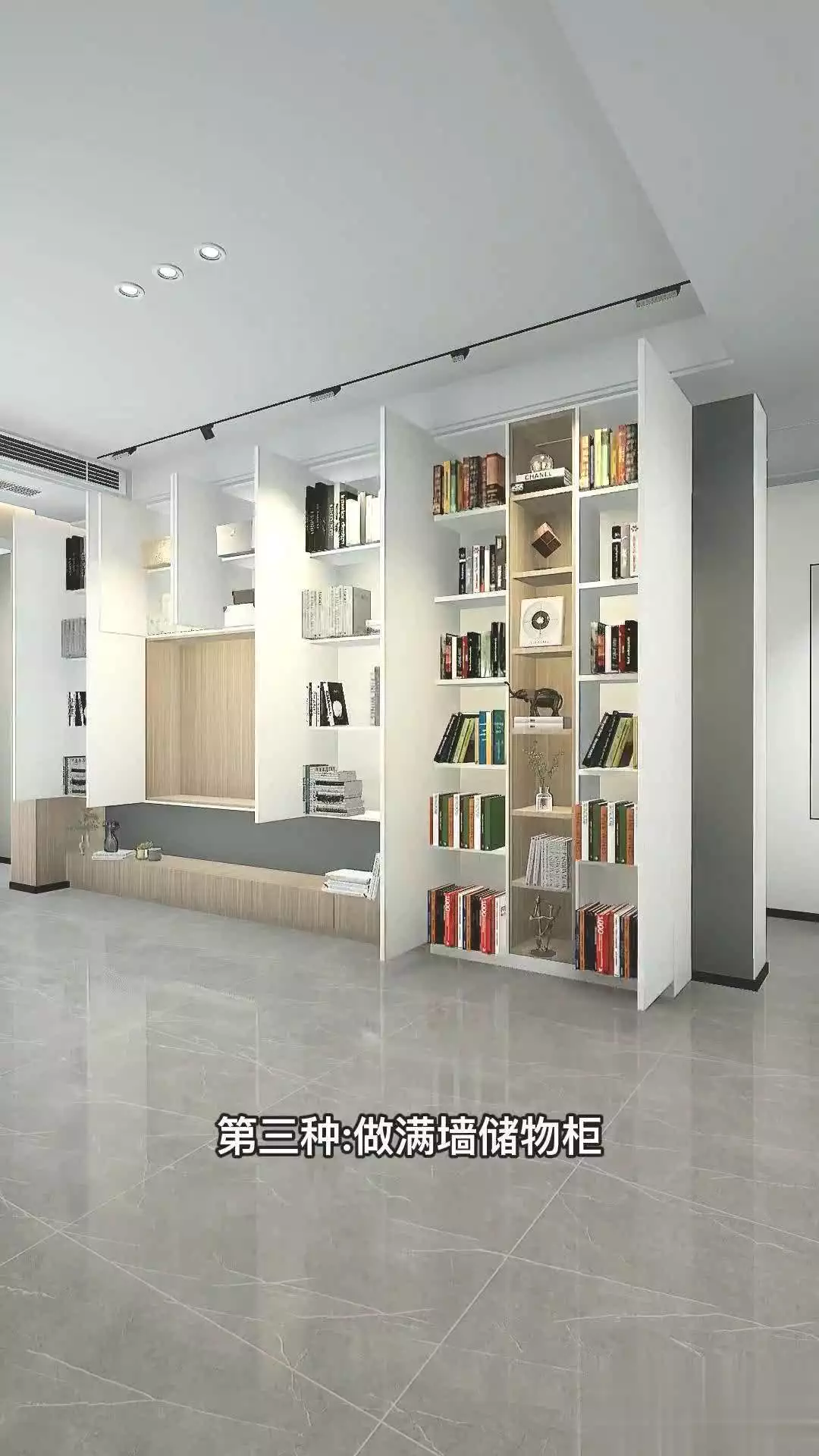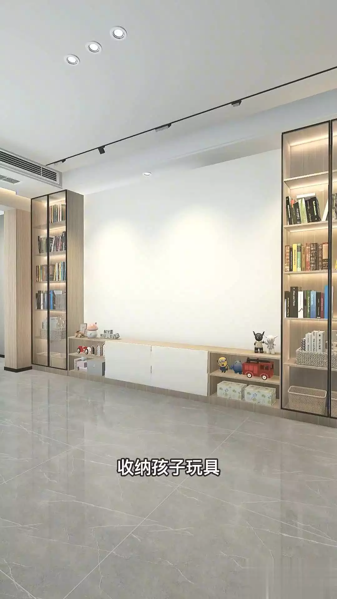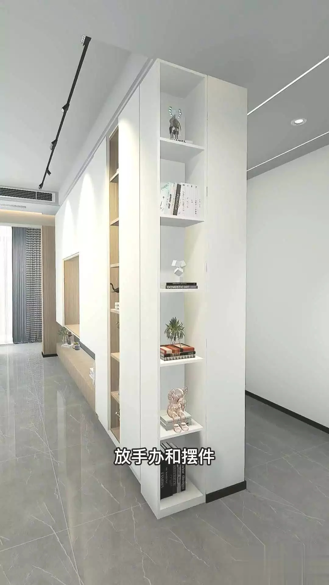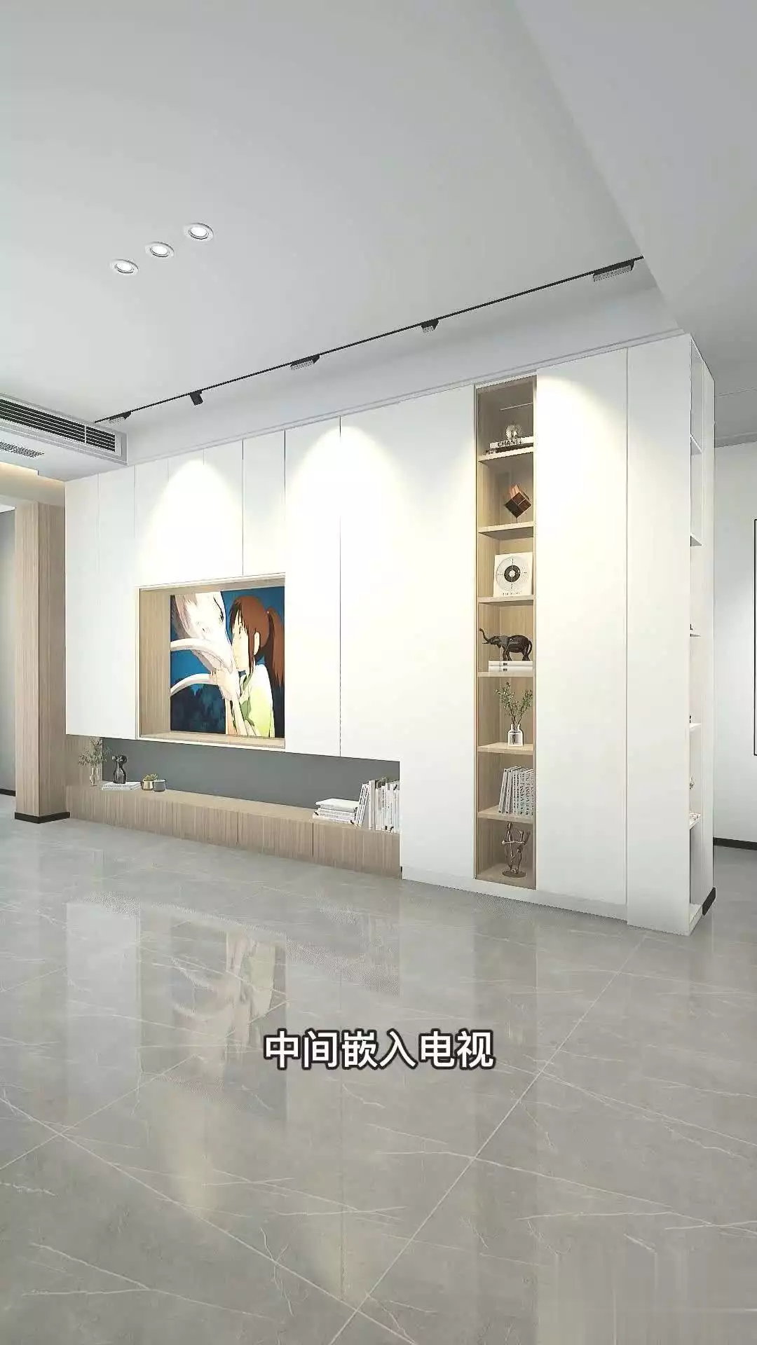 做满墙储物柜,收纳多几倍。侧边留一组开放格,放手办和摆件。中间嵌入电视机,既实用又美观。