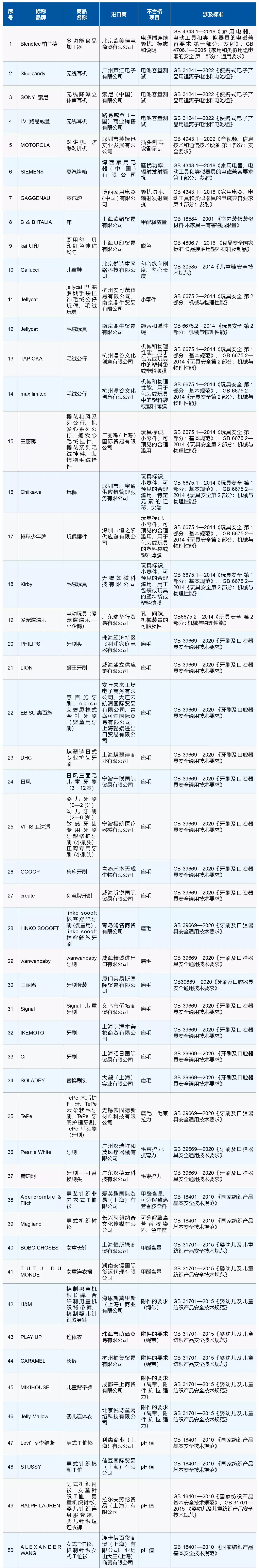 据海关总署介绍,不合格情况包括进口小家电电池容量测试、电器辐射发射项目不合格;进口玩具机械和物理性能、小零件项目不合格;进口服装甲醛含量、可分解致癌芳香胺染料超标;进口家具甲醛释放量超标;进口牙刷磨毛不合格等。